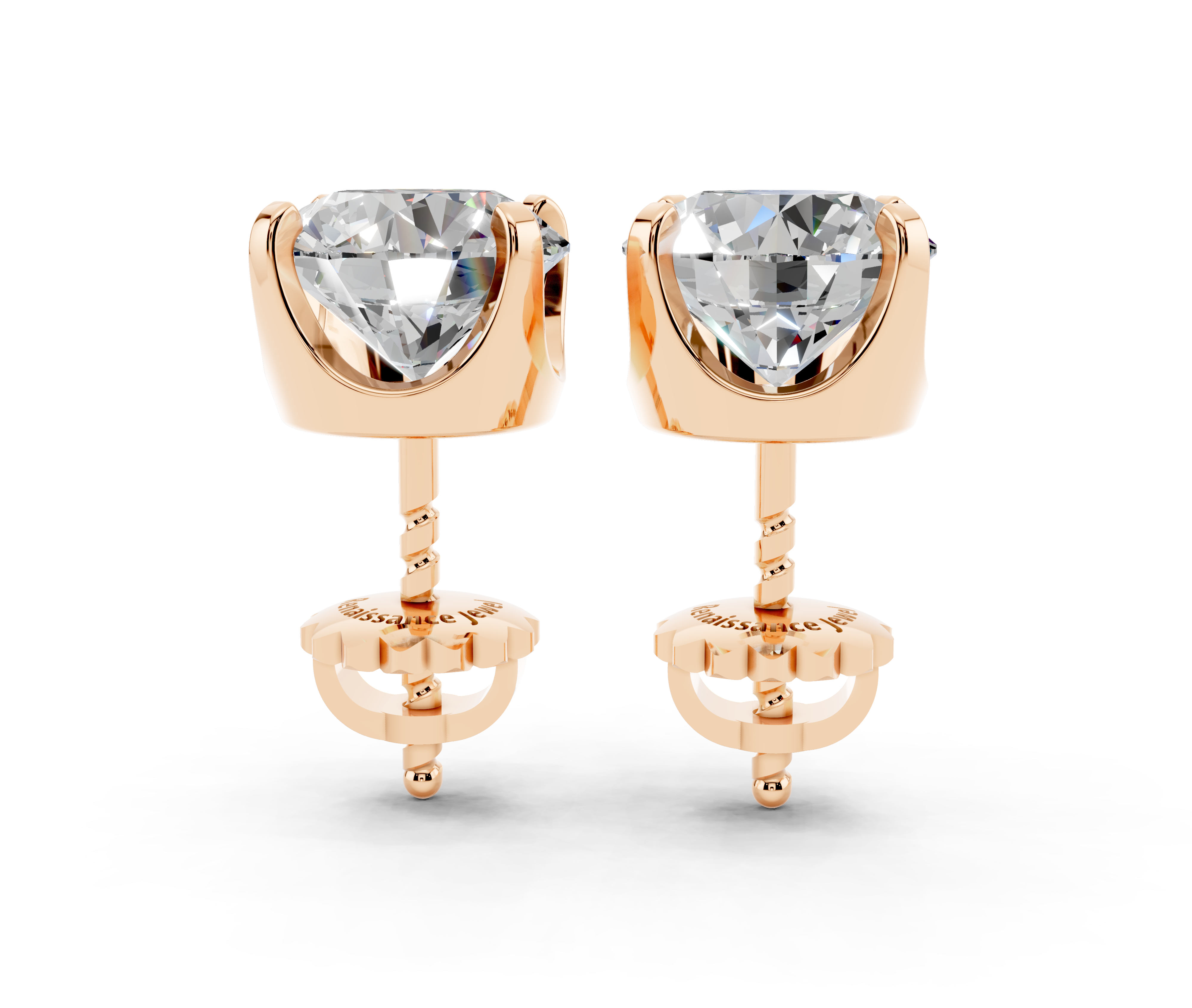 These exquisite earrings feature round brilliant diamonds, each securely held in a classic four-prong basket setting. The stones are expertly cut to maximize their sparkle and brilliance, making them a timeless addition to any jewelry collection. Set in lustrous rose gold, these stud earrings offer a perfect blend of elegance and sophistication, ideal for both everyday wear and special occasions. The secure push-back or screw-back closure ensures comfort and ease of wear, making these earrings a must-have for any jewelry enthusiast.