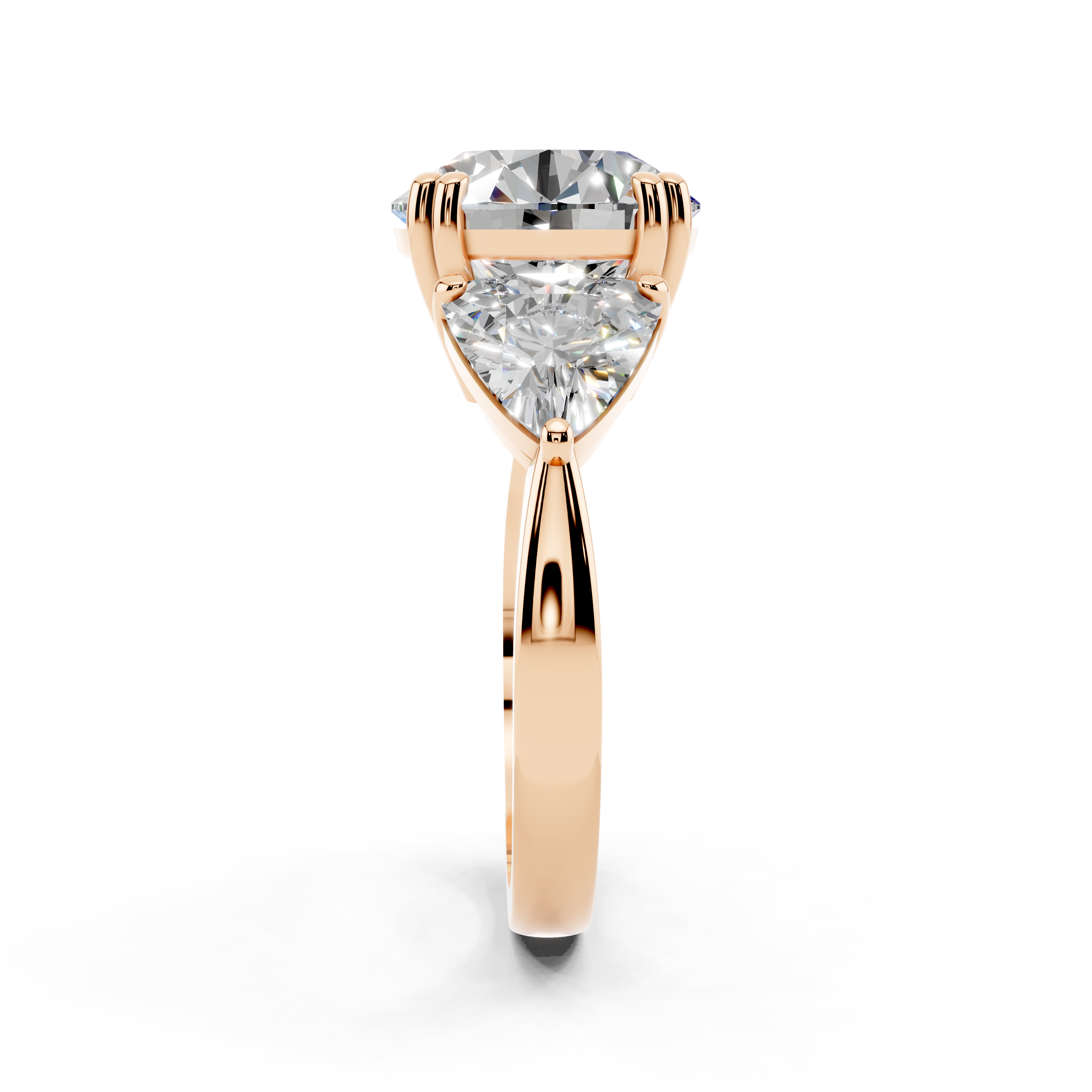 A striking balance of brilliance and elegance, this Rose gold Round Brilliant and Trilliant Diamond Three-Stone Ring is designed to symbolize past, present, and future. The centerpiece features a dazzling round brilliant diamond, celebrated for its unmatched sparkle and fire. Flanking the center stone are two perfectly matched trilliant-cut diamonds, adding a bold, contemporary touch while enhancing the round diamond’s brilliance. Expertly crafted in solid Rose gold, this three-stone ring combines timeless sophistication with modern artistry. The secure prong setting ensures maximum light reflection, highlighting the brilliance of each stone from every angle. Perfect as an engagement ring, anniversary gift, or statement of love, this design is both meaningful and luxurious, destined to be cherished for a lifetime. Details: Metal: Solid Rose gold Center Stone: Round Brilliant Diamond Side Stones: Trilliant-Cut Diamonds Setting: Prong Set Style: Three-Stone Ring Symbolism: Represents past, present, and future