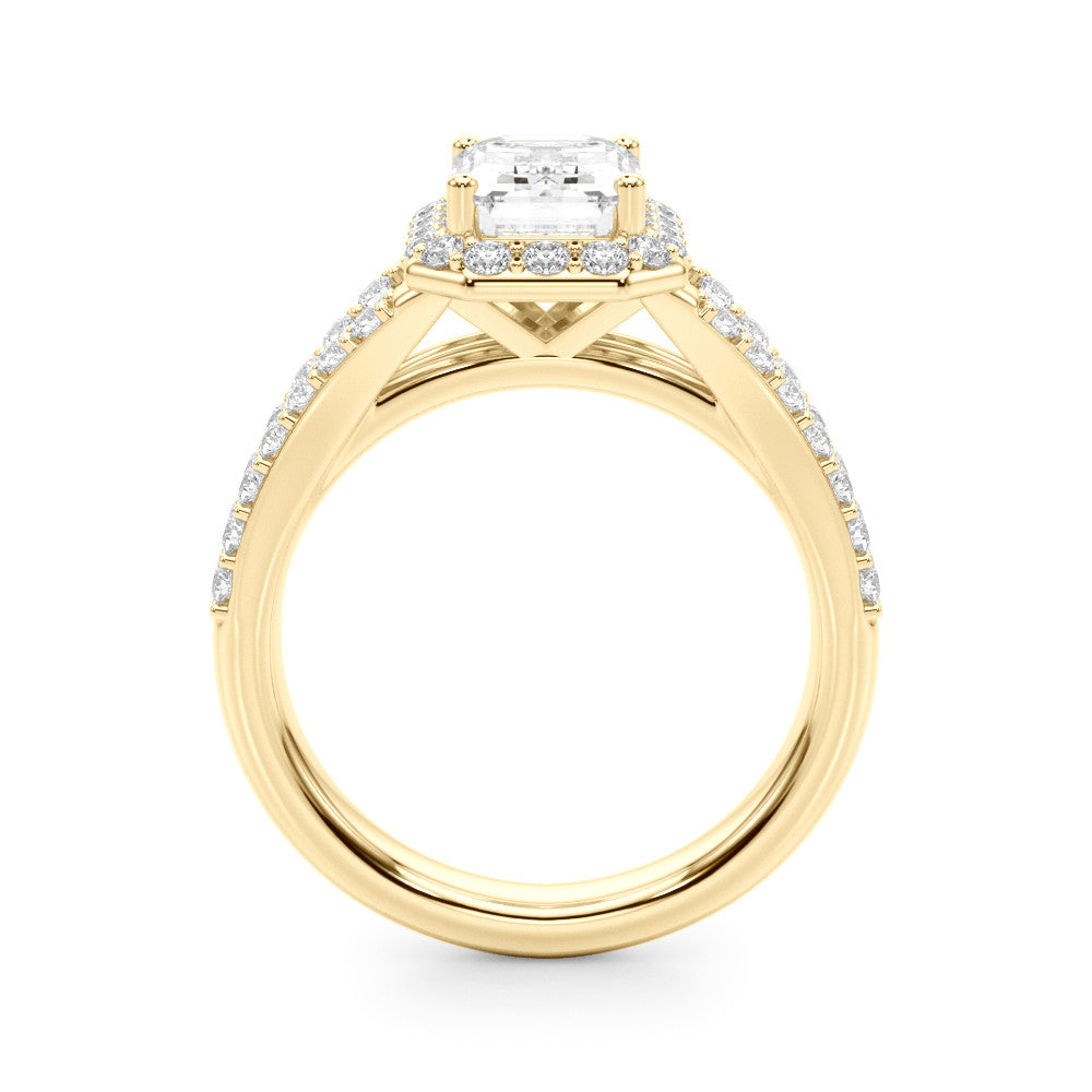 This exquisite ring features a stunning emerald-cut diamond as its centerpiece, elegantly framed by a halo of smaller round diamonds that enhance its brilliance. The split shank band is adorned with additional diamonds, adding a touch of sophistication and sparkle from every angle. The four-prong setting securely holds the central stone, ensuring both style and durability. This ring is a perfect blend of classic elegance and modern design, ideal for those who appreciate timeless beauty with a contemporary twist.