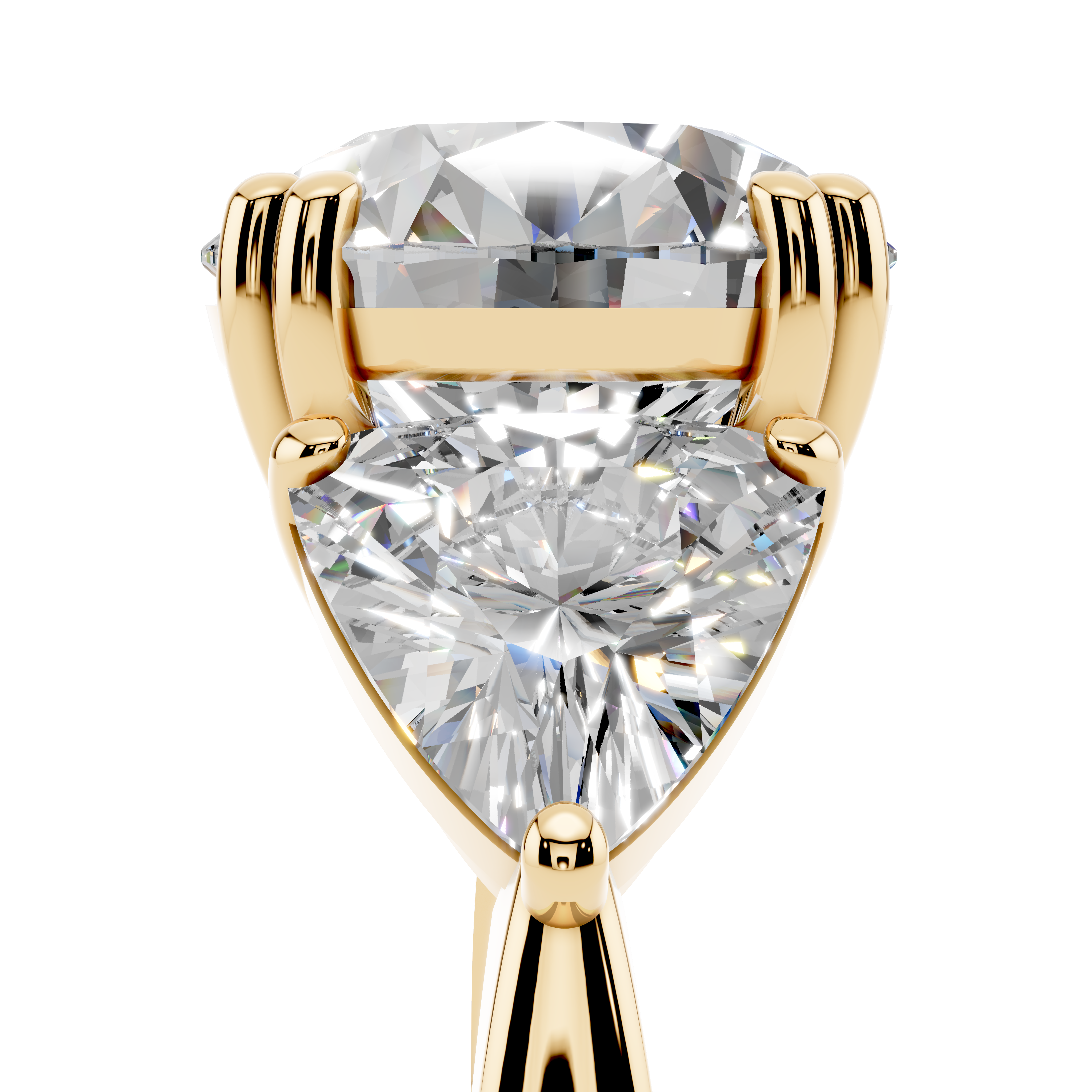 A striking balance of brilliance and elegance, this Yellow gold Round Brilliant and Trilliant Diamond Three-Stone Ring is designed to symbolize past, present, and future. The centerpiece features a dazzling round brilliant diamond, celebrated for its unmatched sparkle and fire. Flanking the center stone are two perfectly matched trilliant-cut diamonds, adding a bold, contemporary touch while enhancing the round diamond’s brilliance. Expertly crafted in solid Yellow gold, this three-stone ring combines timeless sophistication with modern artistry. The secure prong setting ensures maximum light reflection, highlighting the brilliance of each stone from every angle. Perfect as an engagement ring, anniversary gift, or statement of love, this design is both meaningful and luxurious, destined to be cherished for a lifetime. Details: Metal: Solid Yellow gold Center Stone: Round Brilliant Diamond Side Stones: Trilliant-Cut Diamonds Setting: Prong Set Style: Three-Stone Ring Symbolism: Represents past, present, and future